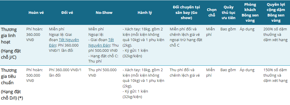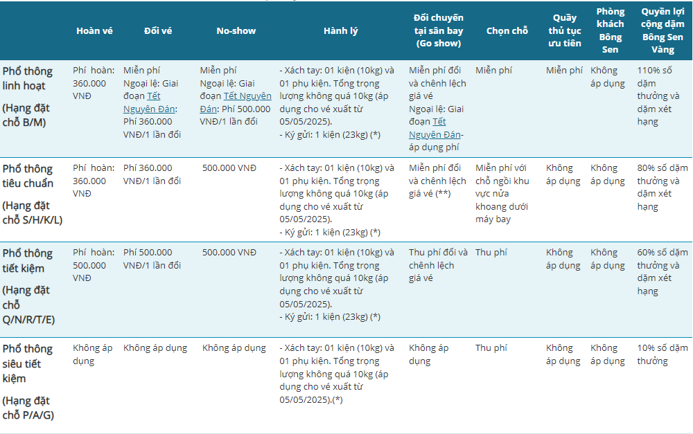 (*) Đối với vé xuất từ 01/12/2025 đến 30/06/2026 và hành trình từ 15/12/2025 đến 30/06/2026 cho hành trình giữa Hà Nội và Tp. Hồ Chí Minh với hạng đặt chỗ I, hành khách lưu ý điều kiện sau: